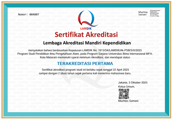Program Studi Pendidikan Ilmu Pengetahuan Alam (IPA) Universitas Bima Internasional MFH merupakan program sarjana yang berkomitmen pada standar keunggulan akademik yang terjamin, dibuktikan dengan status memenuhi syarat minimum Akreditasi berdasarkan Keputusan LAMDIK No. 1913/SK/LAMDIK/Ak-PSB/S/X/2025.